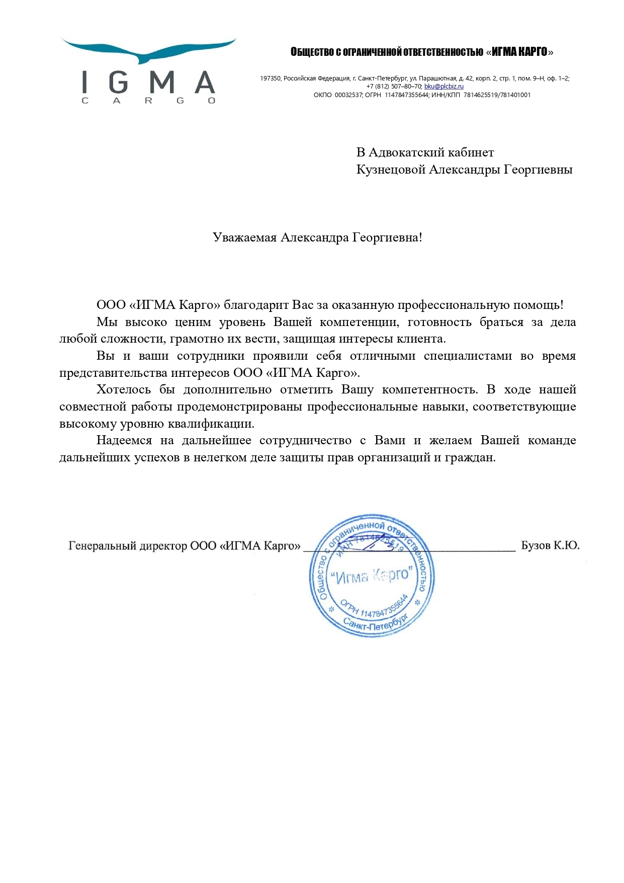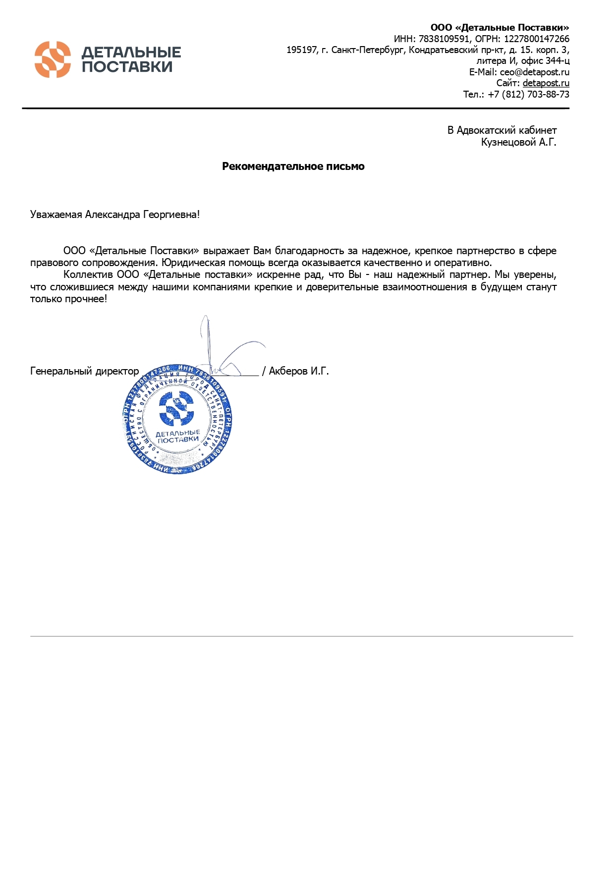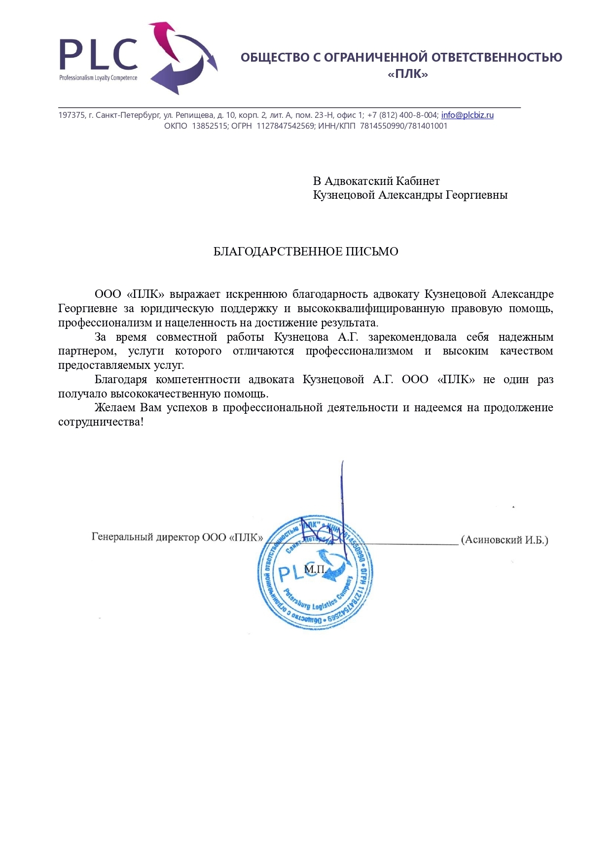Адвокатский кабинет Александры Кузнецовой — это команда квалифицированных юристов, поддерживающих репутацию надежного и компетентного партнера.
